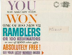 | 62-16 | 1962 Rambler Promo mailer Four Free Prizes for Showroom Visit Excellent condition, coupon removed |